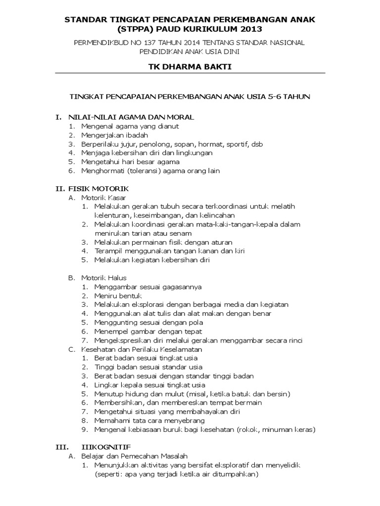 NILAI-NILAI AGAMA DAN MORAL 1. View stppa usia 5-6 tahun pauddocx from aa 1standar tingkat pencapaian perkembangan anak stppa paud kurikulum 2013 permendikbud no 137 tahun 2014 tentang standar nasional pendidikan anak usia. Memahami peraturan dan disiplin 5.
