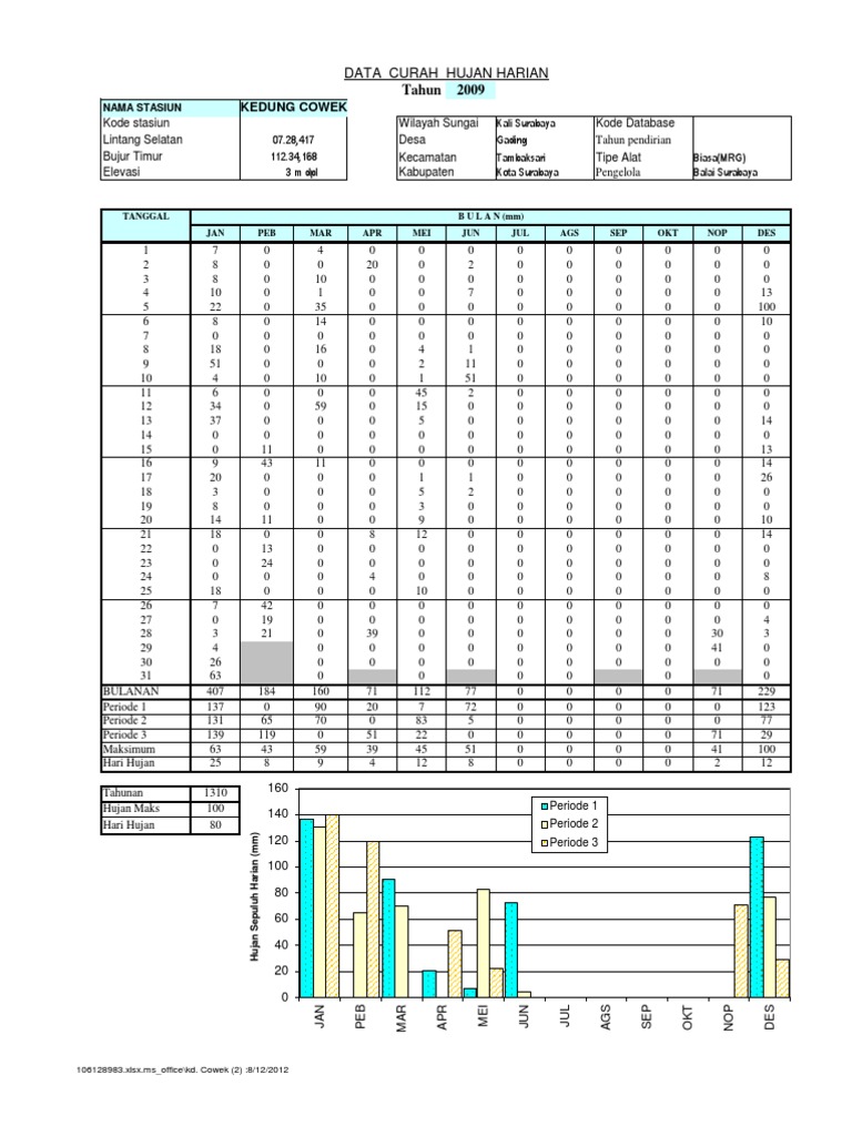 Data Curah Hujan Surabaya by mohammad_birbik. Perubahan curah hujan klimatologis kurun waktu 30 tahunan maka dalam makalah ini disajikan hasil interpretasi dan analisis data curah hujan di Yogjakarta Semarang Surabaya Probolinggo dan Malang dengan menggunakan data curah hujan bulanan selama 105 tahun 1901-2005. Untuk menentukan indeks-indeks tersebut digunakan software RClimDex.