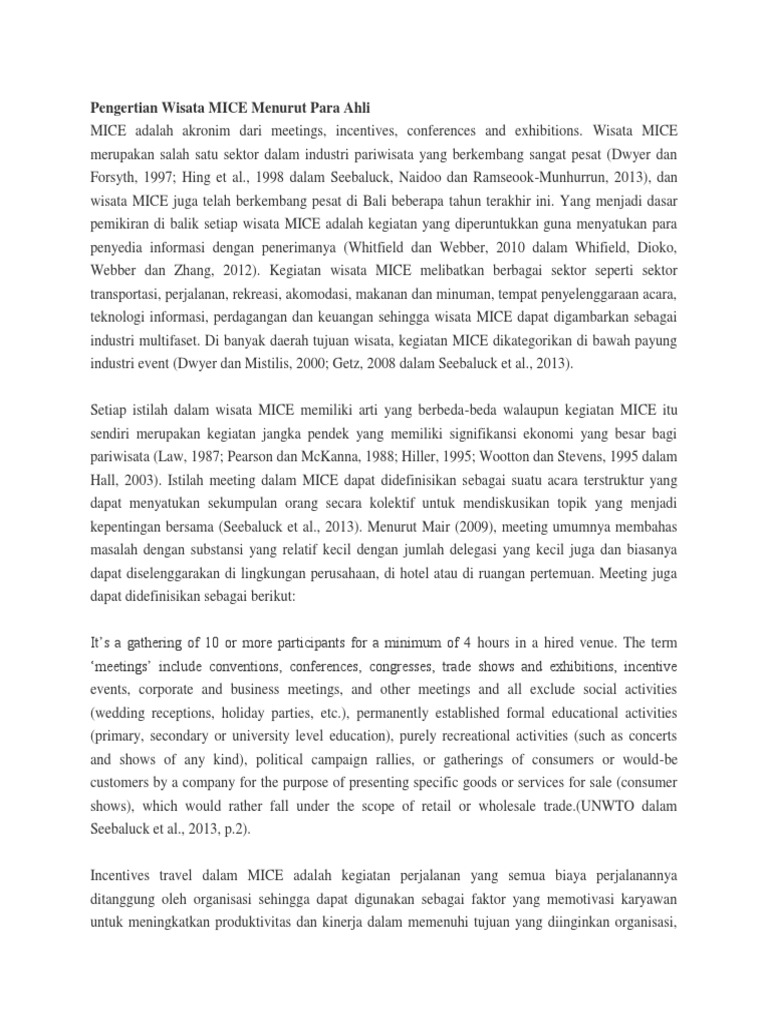 Pengertian Wisata MICE Menurut Para Ahli informasi Manajemen pendidikan Penelitian Pengertian Pengetahuan Pengertian Wisata MICE Menurut Para Ahli MICE adalah akronim dari meetings incentives conferences and exhibitions. Pengertian sejarah menurut para ahli. Dalam prakteknya arti meeting sama saja dengan conference maka secara teknis akronim MICE sesungguhnya adalah istilah yang memudahkan orang mengingat bahwa kegiatan-kegiatan yang dimaksud sebagai.
