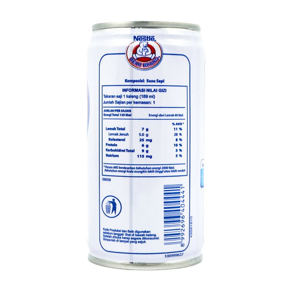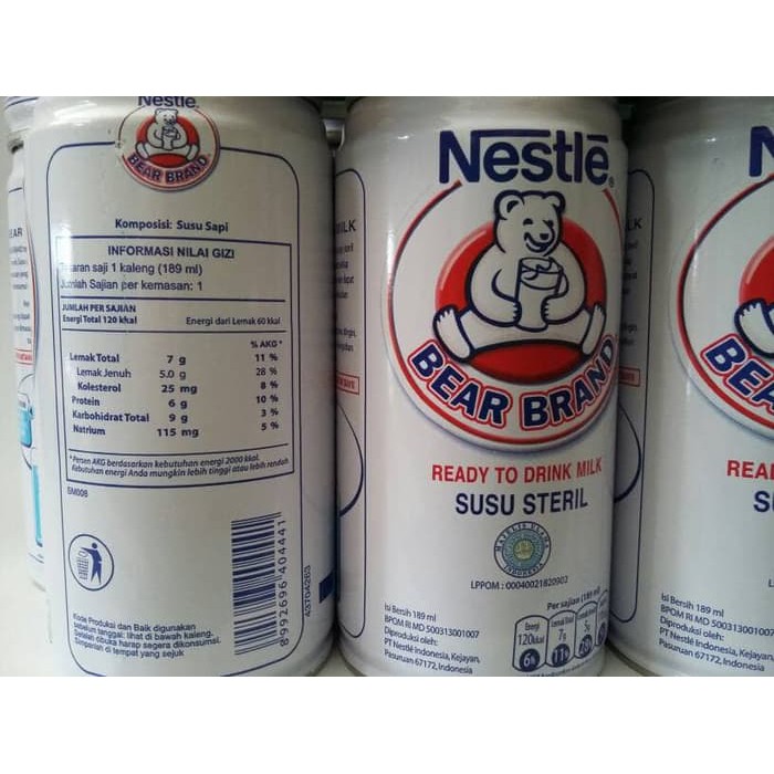 Susu yang terbuat dari 100 susu sapi steril murni. Komposisi dan Kandungan Susu Beruang Diambil dari laman nestle terdapat 2 varian dari susu beruang yaitu. 1 JUMLAH PER SAJIAN Energi Total 120 kkal Energi dari lemak 60 kkal JUMLAH PERSAJIAN AKG AKG Lemak Total 7g 11 Lemak jenuh 5g 28 Kolesterol 25 mg 8 Protein 6g 10 Karbohidrat 9g 3 total Natrium 115 mg 5 AKG berdasarkan kebutuhan energi.