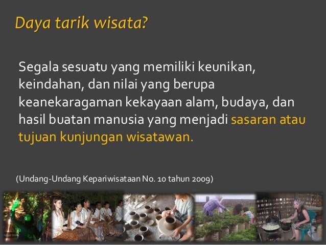 10 tahun 2009 Daya Tarik Wisata dijelaskan sebagai segala sesuatu yang memiliki keunikan kemudahan dan nilai yang berupa keanekaragaman kekayaan alam budaya dan hasil buatan manusia yang menjadi sasaran atau kunjungan wisatawan.