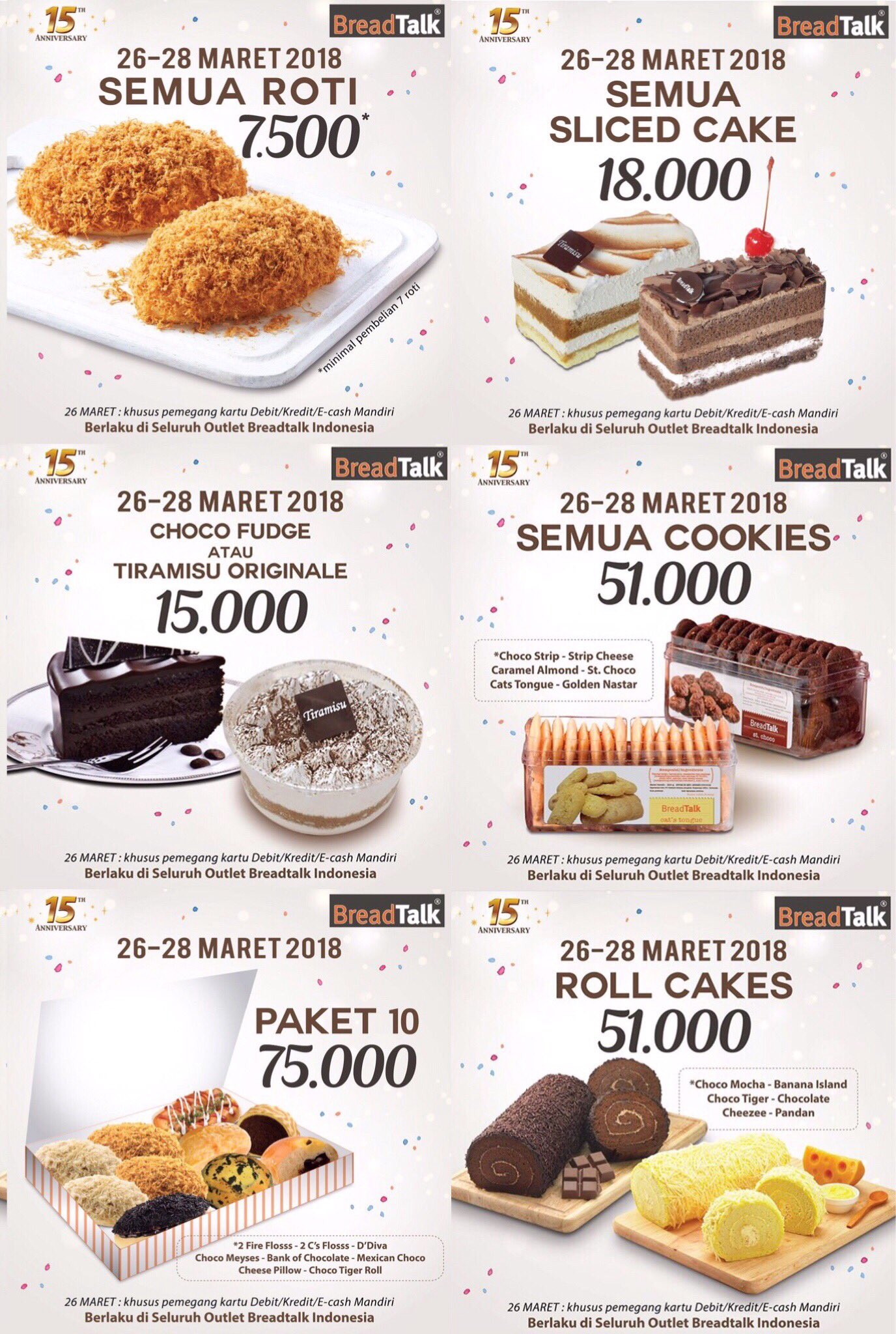 Semua promo berlaku pada tanggal 23-24 Agustus 2016 di seluruh outlet BreadTalk Indonesia dalam jam operasional 1000 2200 wib dan tidak berlaku untuk pemesanan melalui call center delivery. Download FINDAPRO APP and get your 5 BreadTalk Voucher today. Moneyid - Dalam rangka ulang tahun ke-13 Breadtalk memberikan promo untuk semua pembelian roti kue potong slice cake dan whole cakePromo ini berlaku mulai 22-28 Agustus 2016.