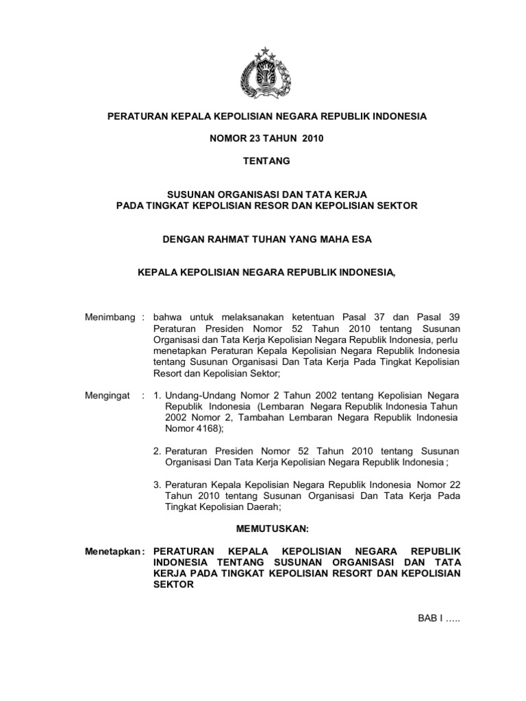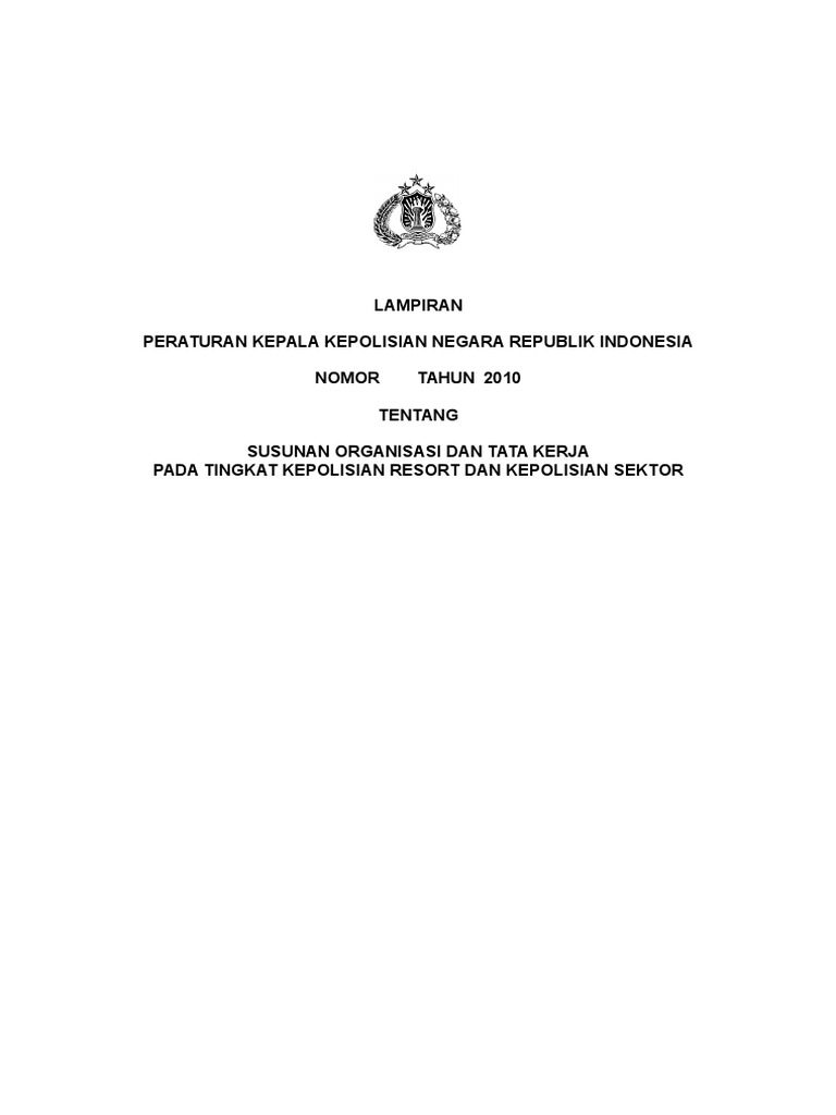 NOMOR 23 TAHUN 2010 TENTANG SUSUNAN ORGANISASI DAN TATA KERJA PADA TINGKAT KEPOLISIAN RESORT DAN KEPOLISIAN SEKTOR DENGAN RAHMAT TUHAN YANG MAHA ESA KEPALA KEPOLISIAN NEGARA REPUBLIK INDONESIA Menimbang. Dokumen Serupa dengan Lampiran Daftar Isi Perkap 23 Tahun 2010. Peraturan kapolri nomor 23 tahun 2010 tentang susunan organisasi dan tata kerja pada tingkat polres.