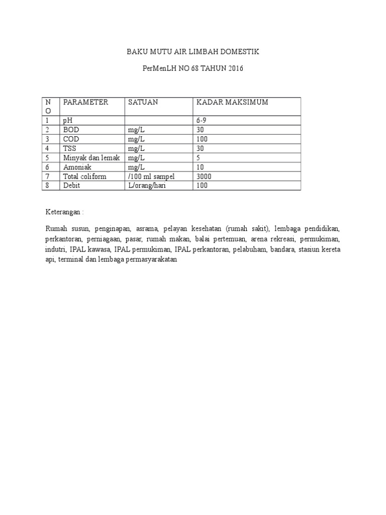 Dengan dikeluarkannya regulasi baru ini maka peraturan sebelumnya yang mengatur terkait Baku Mutu Limbah domestik sudah tidak berlaku. PermenLH No08 Tahun 2009 ttg BM Air Limbah KegPembangkit Listrik Tenaga Thermal. Admin dari blog Tentang Tahun 2020 juga mengumpulkan gambar-gambar lainnya terkait permen lh no 68 tahun 2016 pdf dibawah ini.
