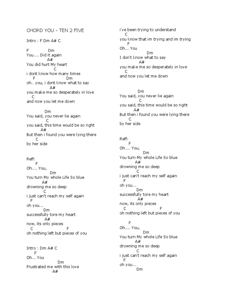 Lirik Lagu Kunci Gitar Chord Ten 2 Five - You. Intro C G Am F Verse 1 C G Am F Im going under and this time I fear theres no one to save me C G Am F This all or nothing really got a way of driving me crazy C G Am F I need somebody to heal somebody to know somebody to have somebody to hold C G Its easy to say but. This chords is contributed by Tobi.